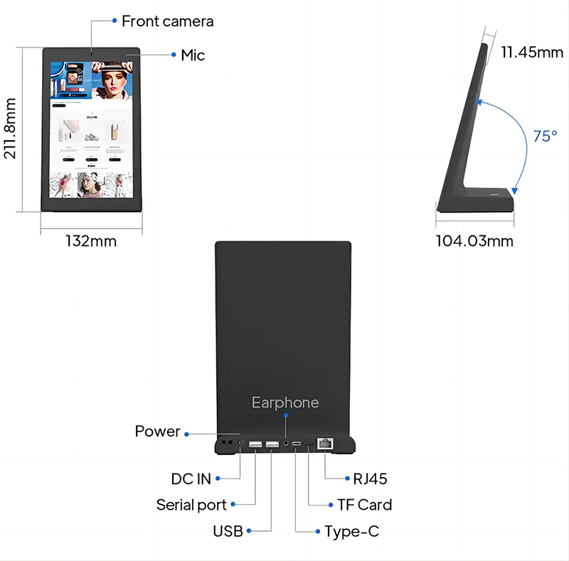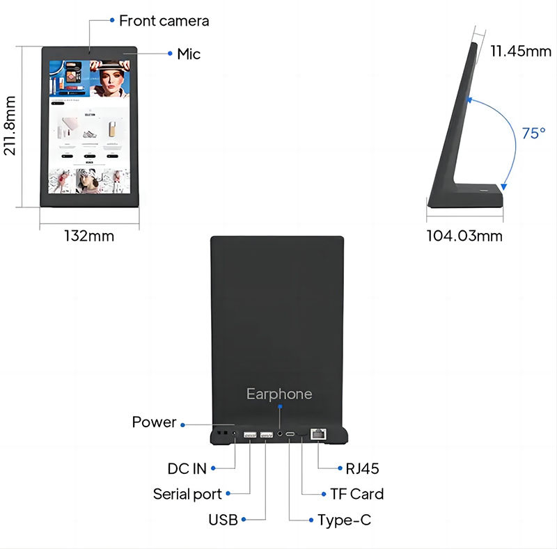 Ten tablet z systemem Android w stylu kiosku został zaprojektowany tak, aby idealnie pasował do recepcji, biur hotelowych, stacji serwisowych i punktów kontaktowych klientów, gdzie przestrzeń jest ograniczona, ale interakcja jest częsta.Struktura w kształcie litery L zapewnia stabilną i elegancką obecność, umożliwiając gościom naturalne zbliżenie się do ekranu i ukończenie kroków zwrotnych lub serwisowych bez zaangażowania personeluDla integratorów i dystrybutorów urządzenie to oferuje niezawodną podstawę sprzętową dla systemów obsługi klienta, zarządzania kolejkami, platformy oceny gości i lekkich aplikacji samoobsługowych.